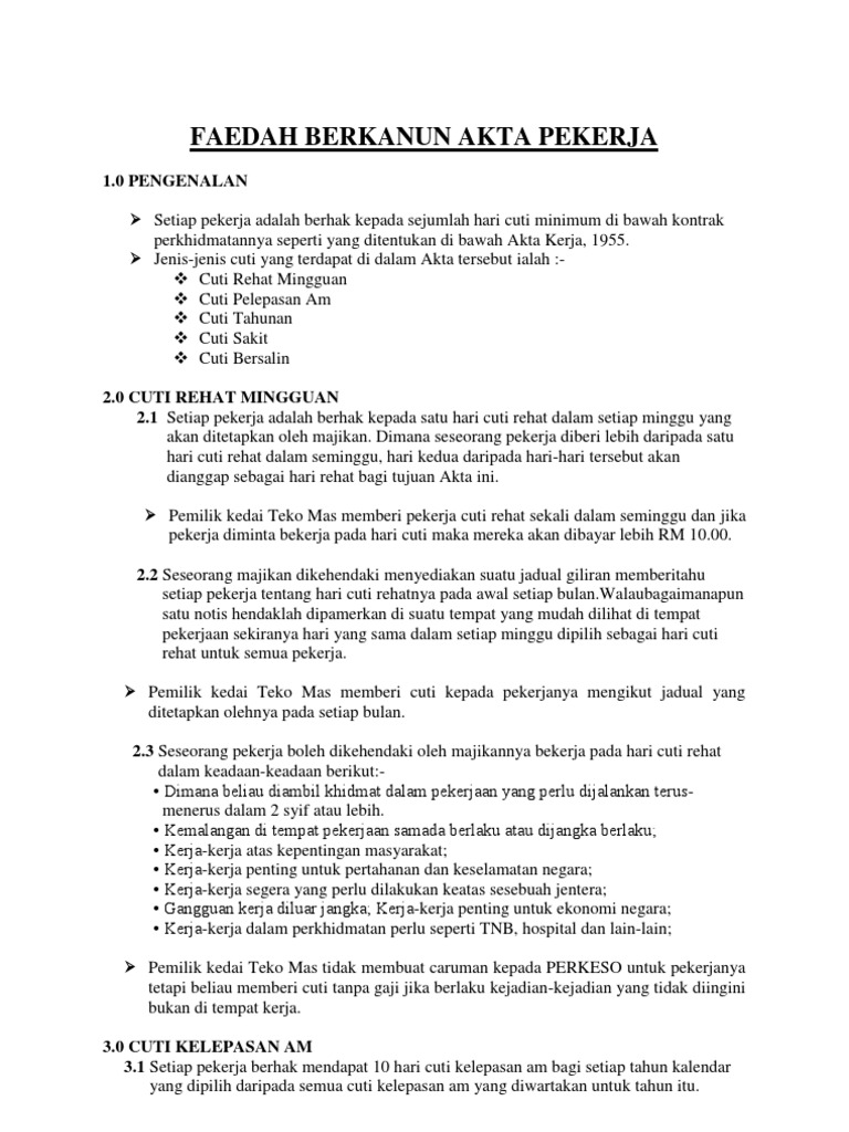 Cuti bersalin boleh diambil lebih awal apabila mendapat pengesahan dari pegawai perubatan atau pengamal perubatan berdaftar yang dilantik oleh majikan. Pihak kerajaan juga akan meneliti semula akta kerja 1955 meliputi empat perkara termasuk tempoh cuti , bagi memastikan akta tersebut kekal relevan dengan. Pekerja yang dilindungi di bawah akta kerja 1955 ialah semua pekerja yang menerima gaji tidak melebihi rm2,000.00 sebulan dan juga semua pekerja manual tanpa had gaji. Contoh minit mesyuarat kali pertama pelantikan ajk surau contoh modul aktiviti team building contoh notis gangguan bekalan air contoh pengenalan kerja kursus sejarah contoh penyakit berjangkit dan tidak berjangkit contoh perbincangan dalam laporan contoh objektif kerjaya dalam resume contoh poster makanan halal dan. Telah bekerja selama 90 hari dalam tempoh 9 bulan sebelum bersalin;